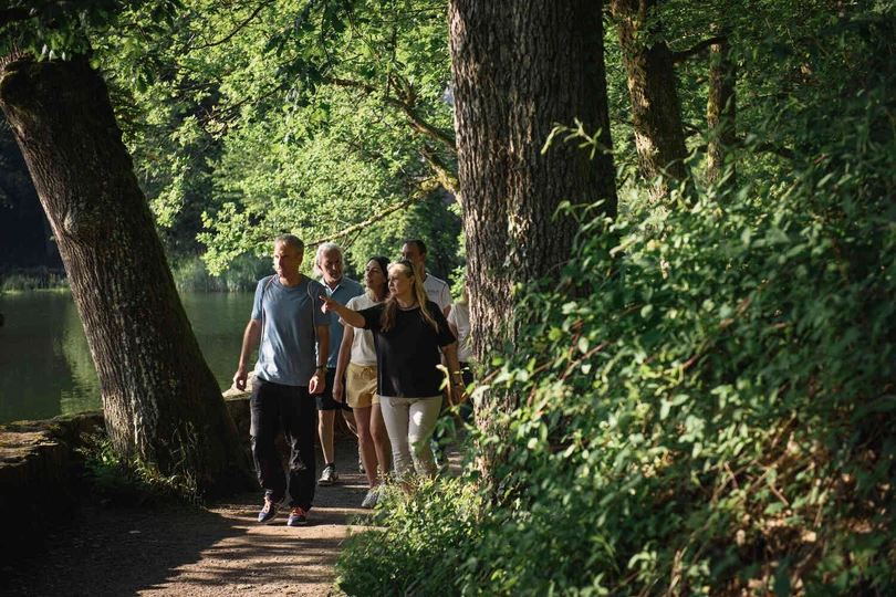 Ruhiger See mit spiegelnder Wasseroberfläche, umgeben von dichtem Wald; im Vordergrund überhängende Baumäste im warmen Sonnenlicht