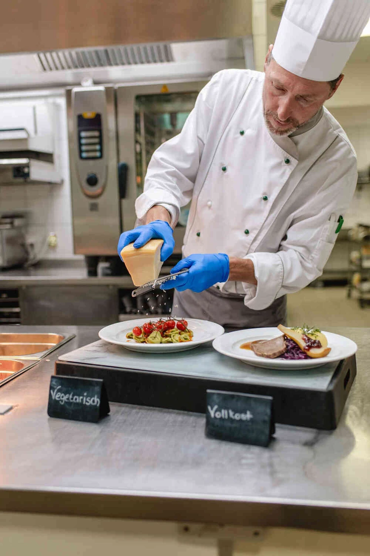 Bei uns kümmern sich Küchenchef Heinz Frommherz und sein Team um einen ausgewogenen und abwechslungsreichen Speiseplan. Zu den Hauptmahlzeiten können Sie zwischen verschiedenen Menüs, kalten und warmen Speisen wählen. Unsere Küche ist von regionalen und saisonalen Zutaten geprägt. Alle Mahlzeiten werden vom Küchenteam frisch zubereitet. Und auch auf spezielle Essenswünsche sind wir eingestellt – egal ob vegan, gluten- oder lactosefrei.
